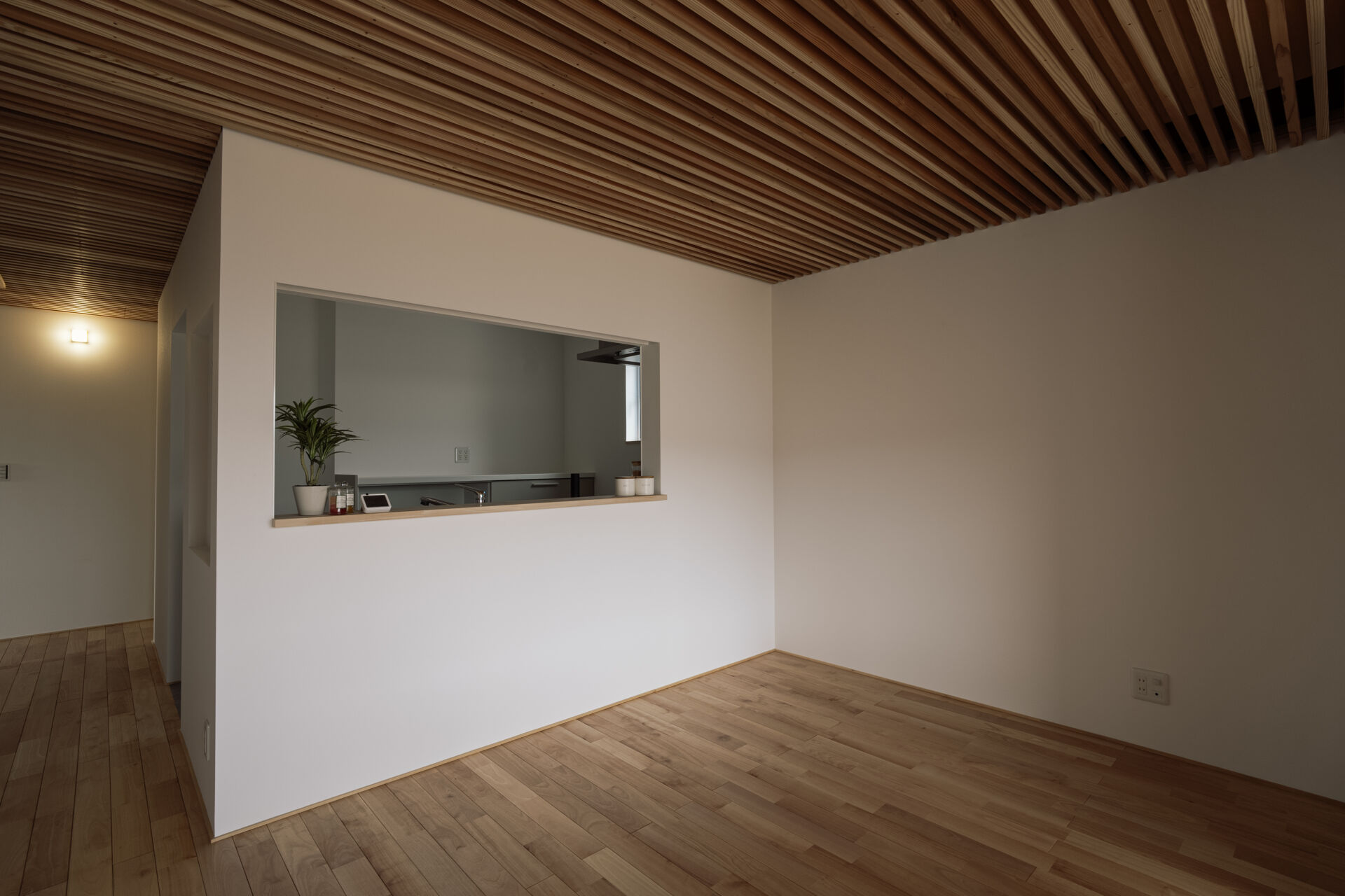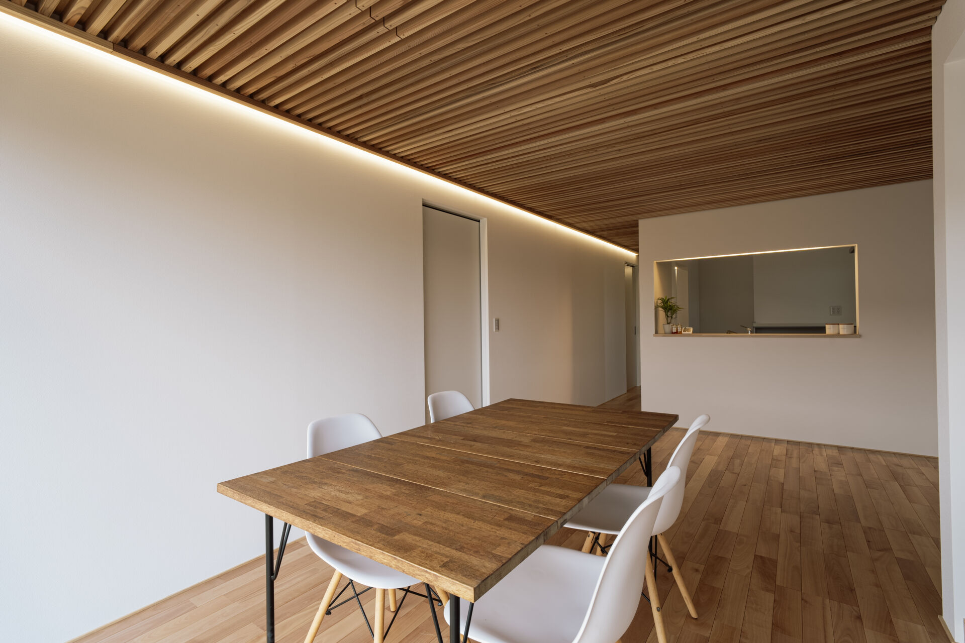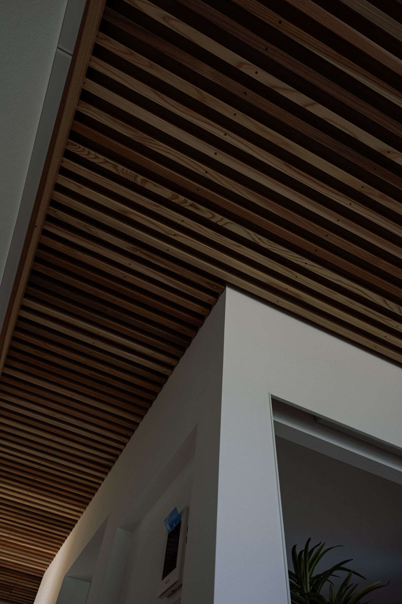 木と木の隙間から空調冷房の涼しい風が吹きおろし部屋全体だけでなく、家全体が涼しくなる計画にしています。